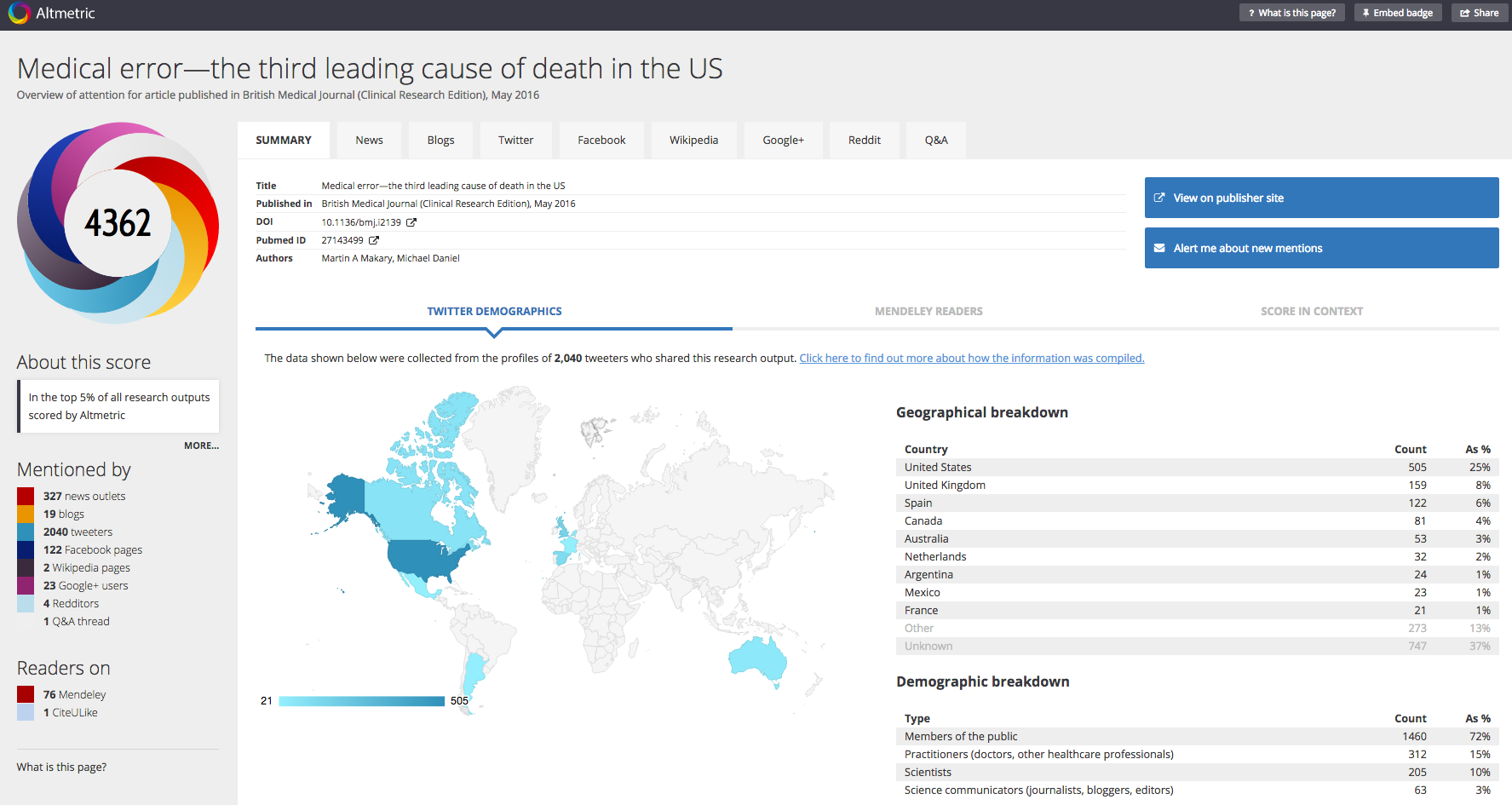 The summary tab contains general information regarding the paper. The title, where it was published, its publication date, the identifier associated with the output (DOI, Pubmed ID, handle etc.), and the author(s)' name(s). The summary tab also contains a visual representation of the location of Twitter users and Mendeley readers who are sharing the output. It also contains the "score in context" this presents the relationship between this research output and ones written regarding the same topic, published by the same organisation, and/or published at the same time.