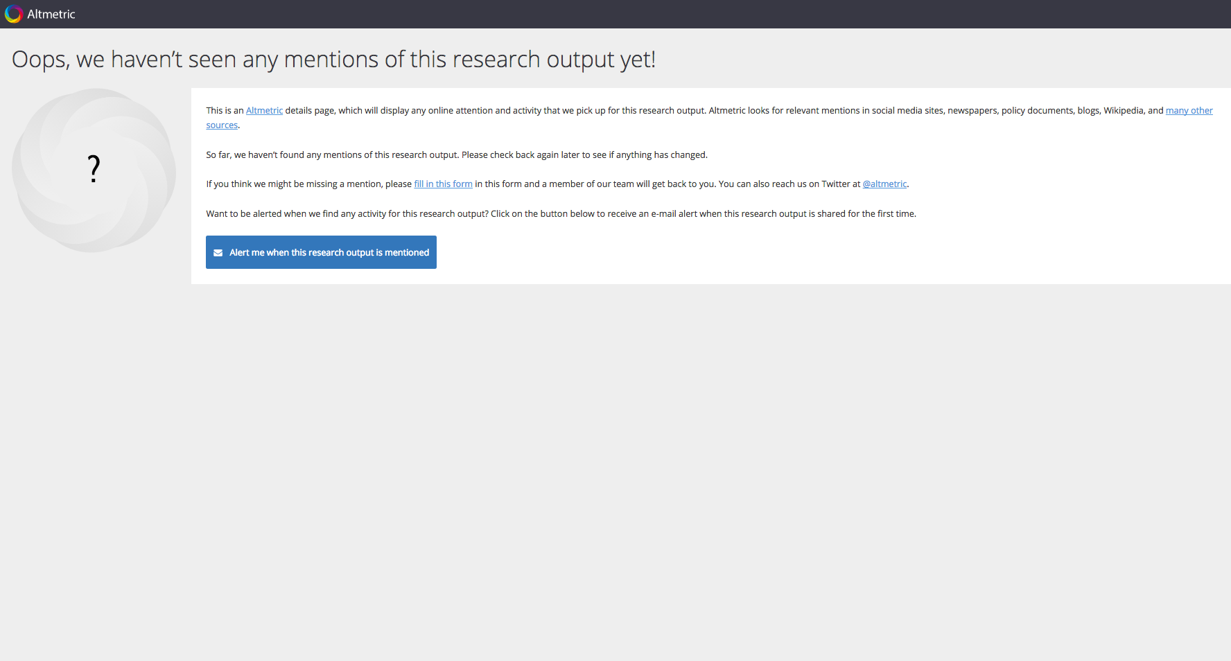 If the article hasn't been mentioned at all, it will be represented by a different type of page. This page shows no summary tab, though it does still provide the option to be alerted to new mentions.